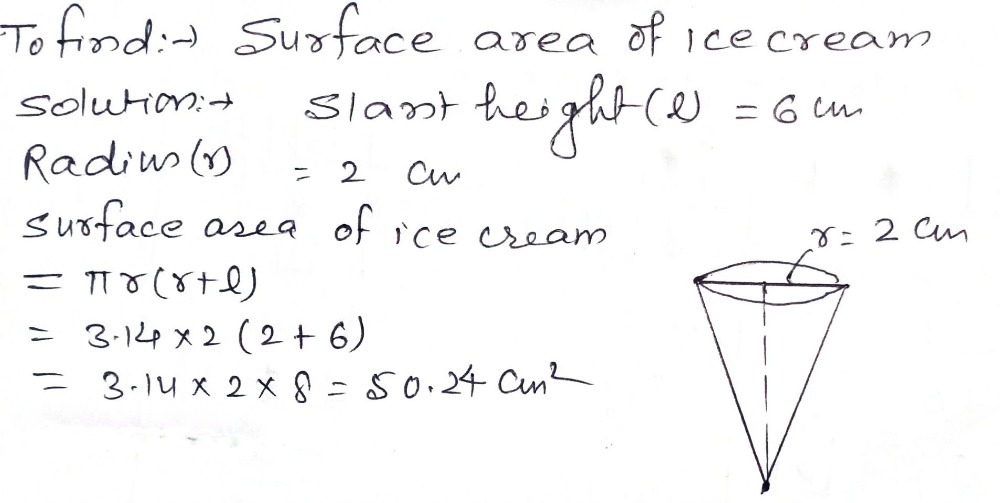 As shown in the fig. How to find the surface area of a cone: So, radius and slant height of cone are 6 cm and 10 cm respectively. The diameter of the base is the circumference divided by , which is this is also the height. Surface area of cone calculated by using following formula: